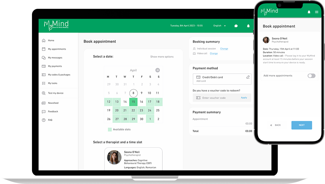 At MyMind, confidentiality and privacy are paramount. Our secure platform ensures all online therapy sessions are strictly confidential and adhere to the highest professional standards. Therapists undergo continuous audits to maintain our rigorous standards, allowing you to engage in therapy comfortably and securely from any location in Ireland.
